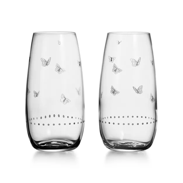 Apparus pour la première fois au XIXe siècle sur les articles d’orfèvrerie de Tiffany & Co., les motifs faune et flore de la collection Tiffany Jardin reflètent la beauté de la nature. Ces deux coupes à vin rouge sans pied sont animées de papillons en vol délicatement gravés. Créez une table harmonieuse avec d’autres articles de table Tiffany Jardin ou associez différentes collections entre elles pour un style unique.