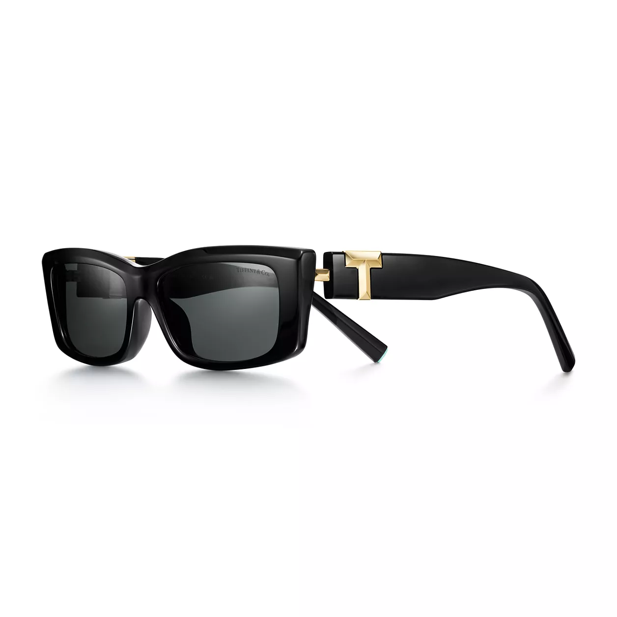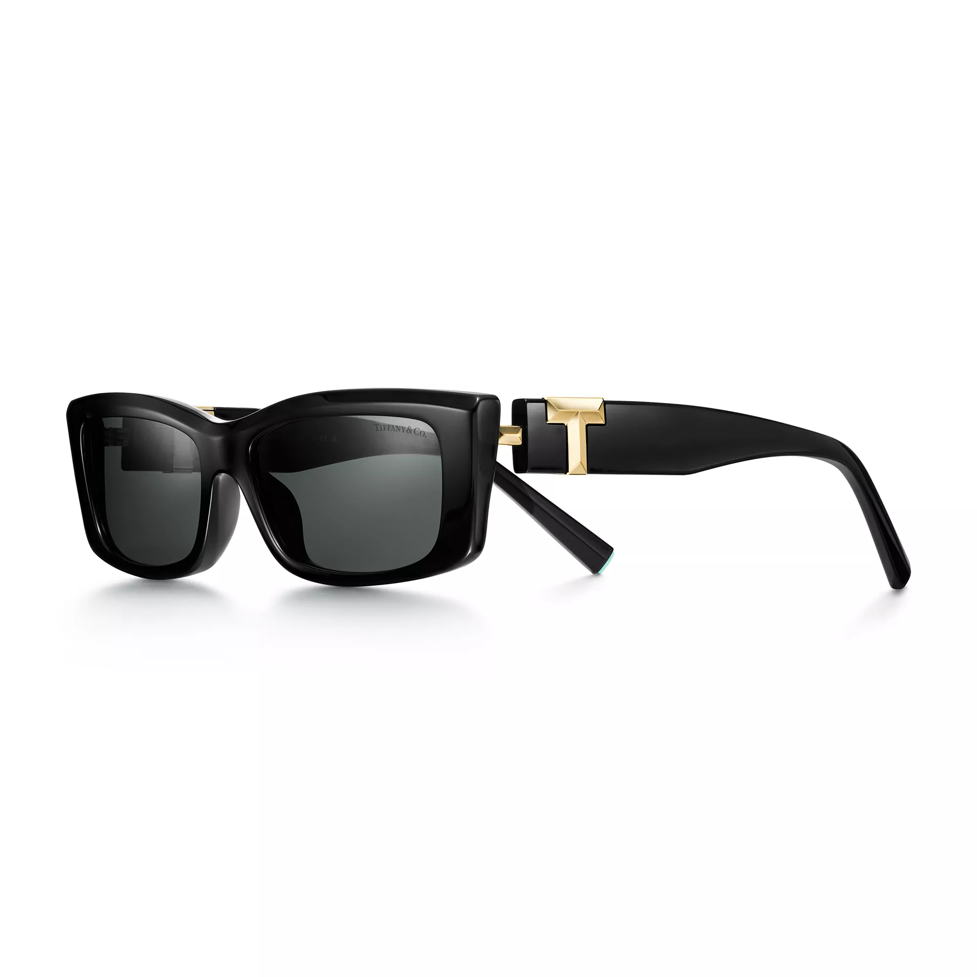 Le code emblématique de la Maison est de retour. Inspirées de notre lettre préférée, les branches des lunettes de soleil Tiffany T présentent un superbe design. Confectionnée en acétate noir accentué de détails en métal doré pâle, cette monture présente des verres rectangulaires gris foncé. Exprimez l’audace avec cette élégante paire de lunettes de soleil.