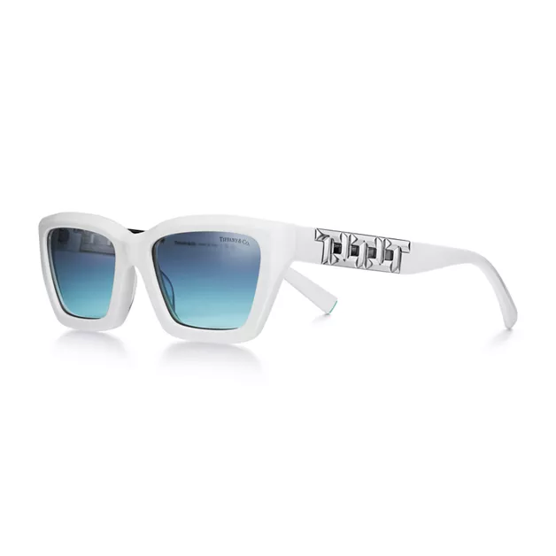 Le code emblématique de la Maison est de retour. Inspirées de notre lettre préférée, les branches des lunettes de soleil Tiffany T présentent une superbe silhouette. Confectionnée en acétate blanc accentué de détails en métal argenté, cette paire de lunettes de soleil présente des verres Yeux de chat Tiffany Blue®.