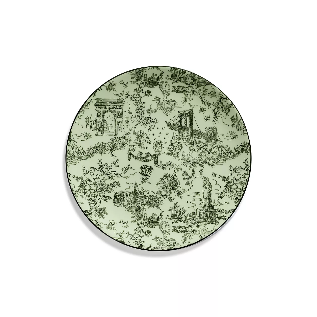Les créations Tiffany Toile évoquent avec fantaisie la ville natale de Tiffany et son héritage. Entre rêverie et élégance, le graphisme s’inspire d’une illustration de New York provenant des archives de Tiffany. Le pont de Brooklyn rejoint Bird on a Rock et la Statue de la Liberté se mêle à un diamant Tiffany & Co. Cette assiette couleur tanzanite est ornée d’un dessin travaillé et d’une bordure noire peinte à la main. Complétez votre collection avec un mug Tiffany Toile.