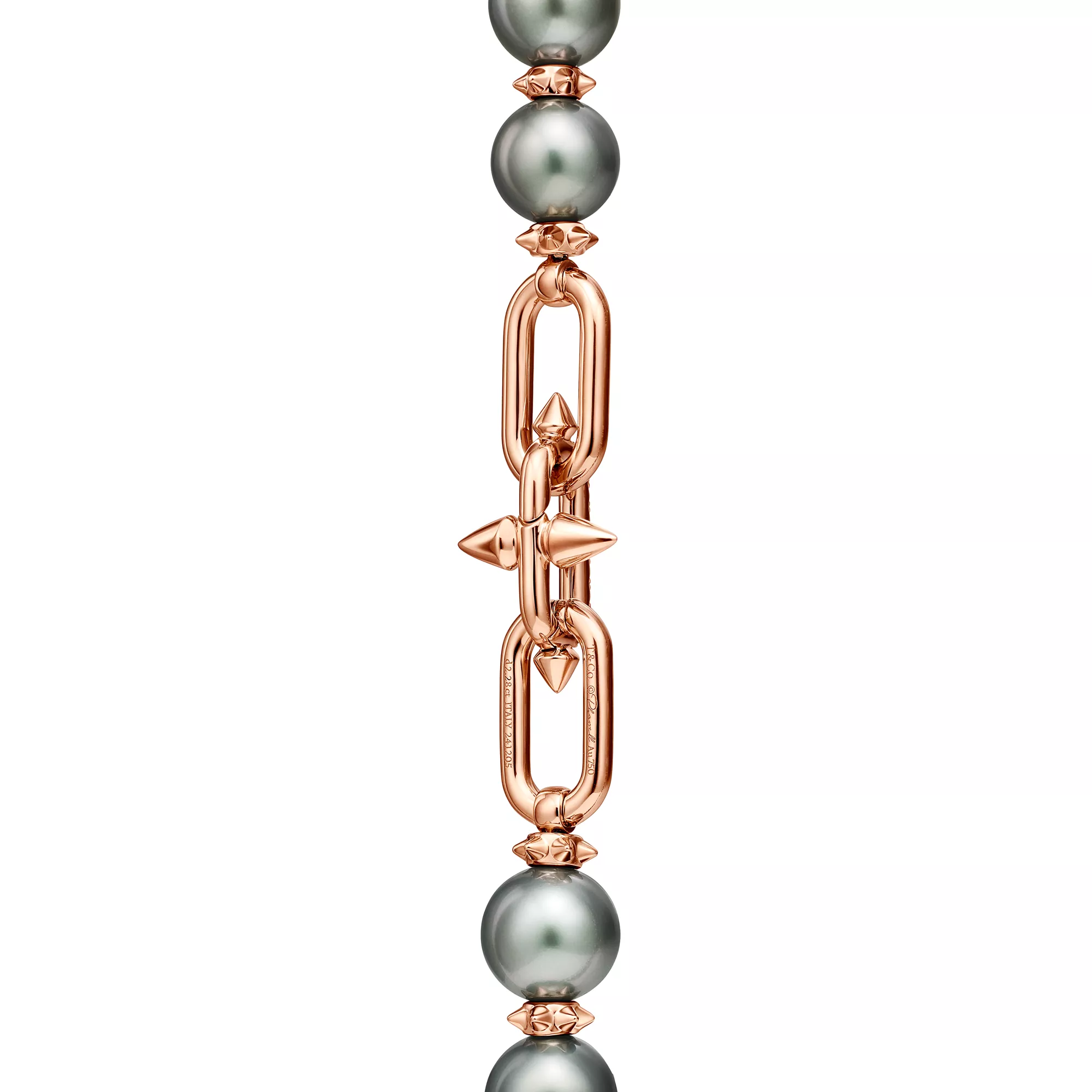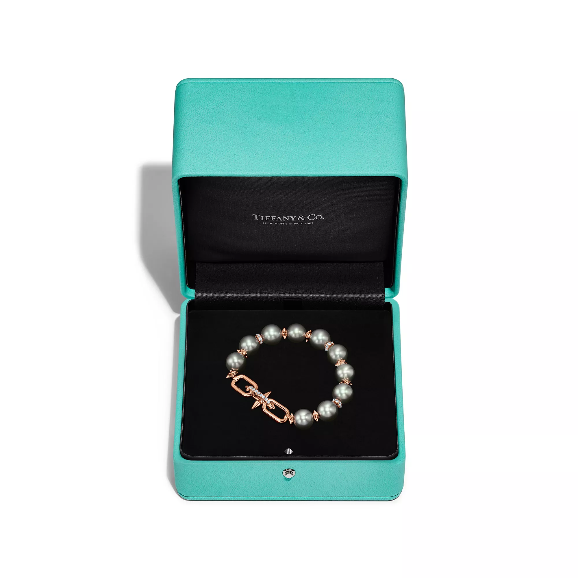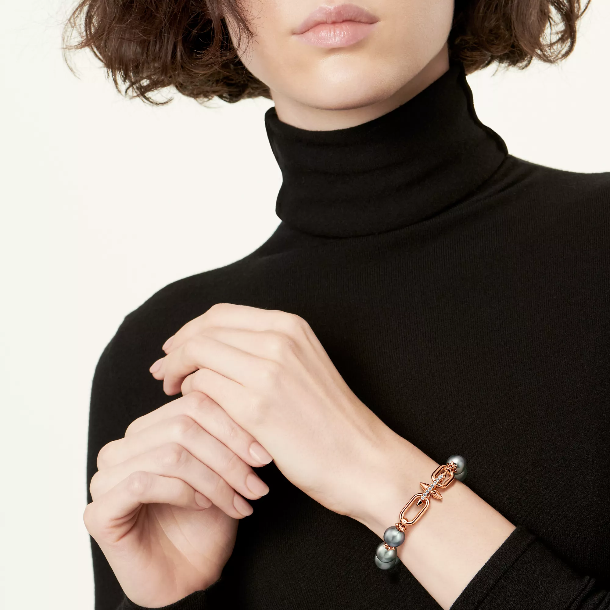 La Maison poursuit sa tradition de collaboration avec des artistes visionnaires et dévoile la collection Tiffany Titan by Pharrell Williams, expression d’une créativité rebelle. Les créations en perles de Tahiti Tiffany Titan by Pharrell Williams sont ornées de magnifiques perles noires des mers du Sud entourées d’or rose 18 carats et de diamants sertis pavé. Inspirées par Poséidon et son trident, des rondelles à pointes en or 18 carats alternent avec de larges perles pour créer un effet captivant, tandis qu’un fermoir en diamant sublime l’éclat du bijou.