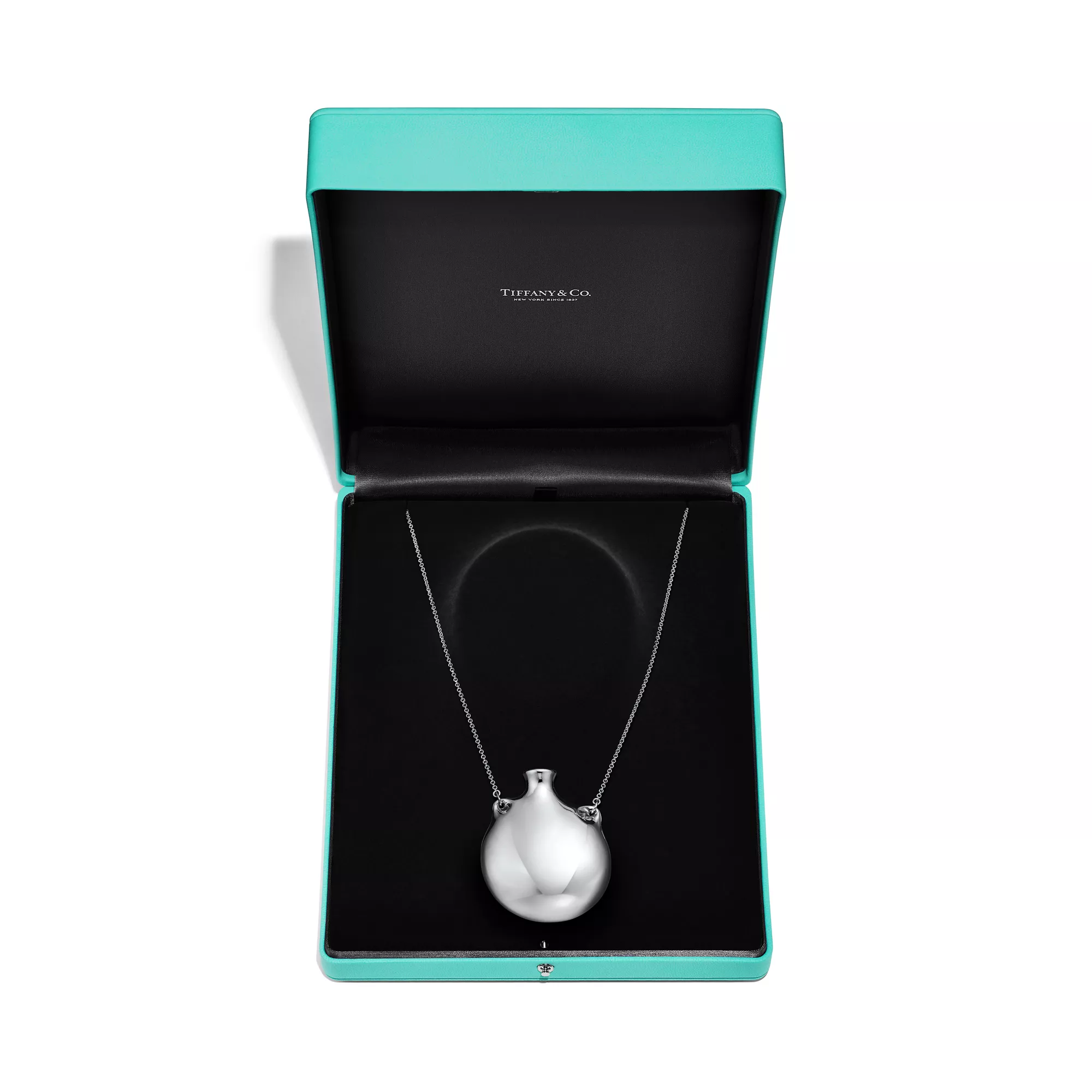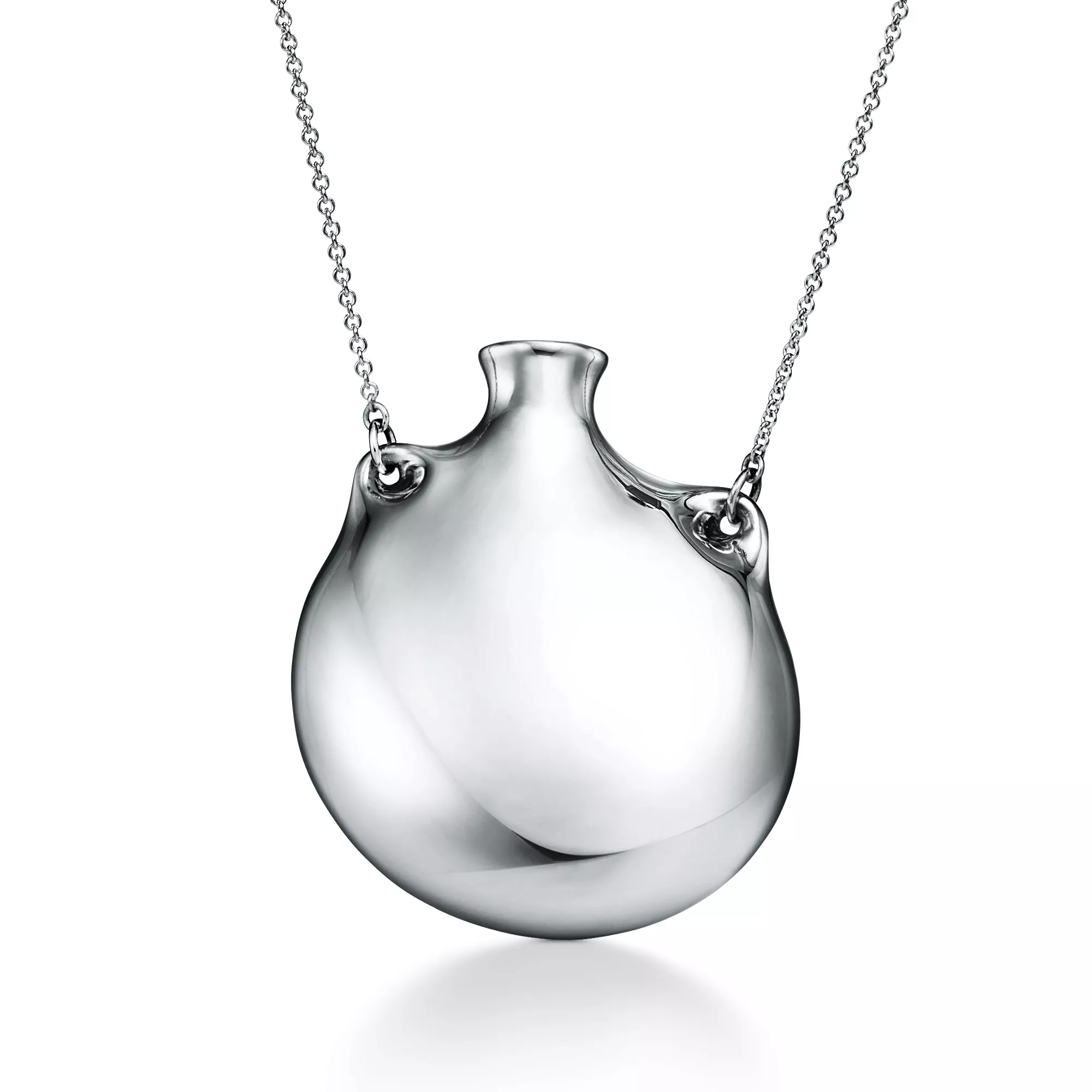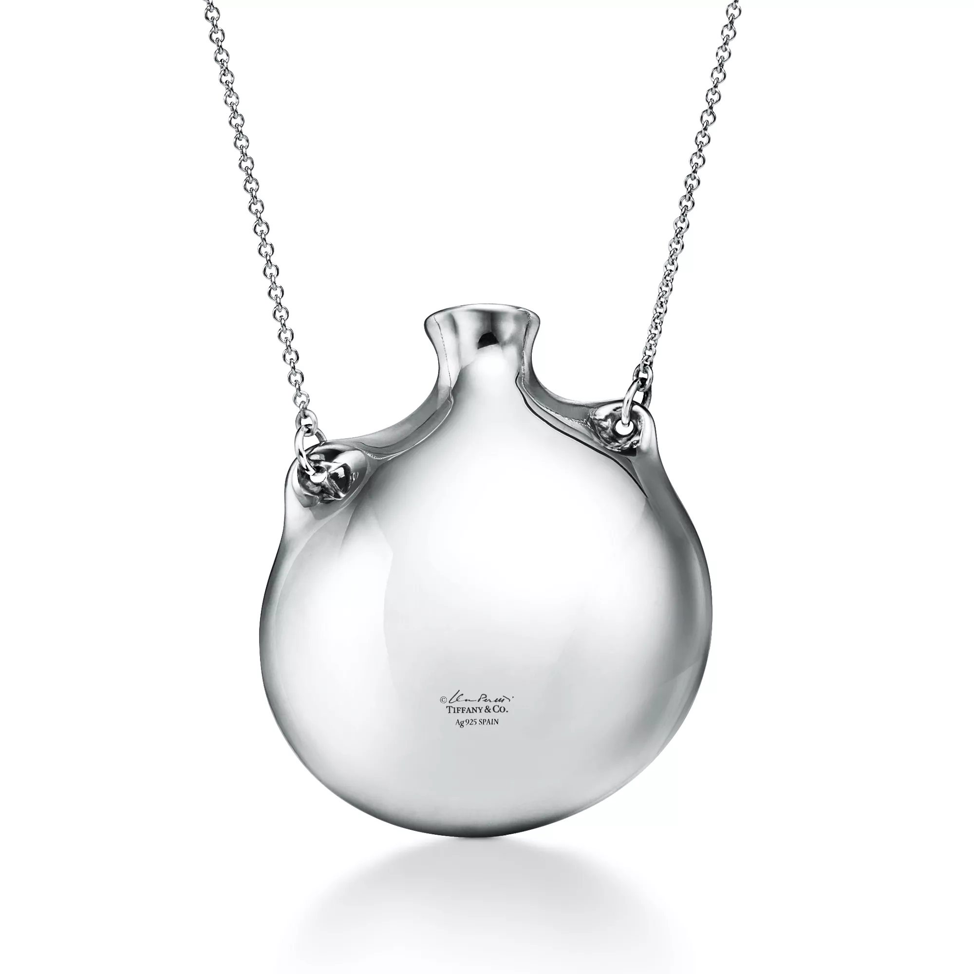 Une des toutes premières créations d'Elsa Peretti. Pendentif en argent massif. Taille : Large, sur une chaîne de 81 cm. 63 x 54 mm. Le flacon est ouvert, on peut y glisser une fleur. Créations originales, tous droits réservés à Elsa Peretti.