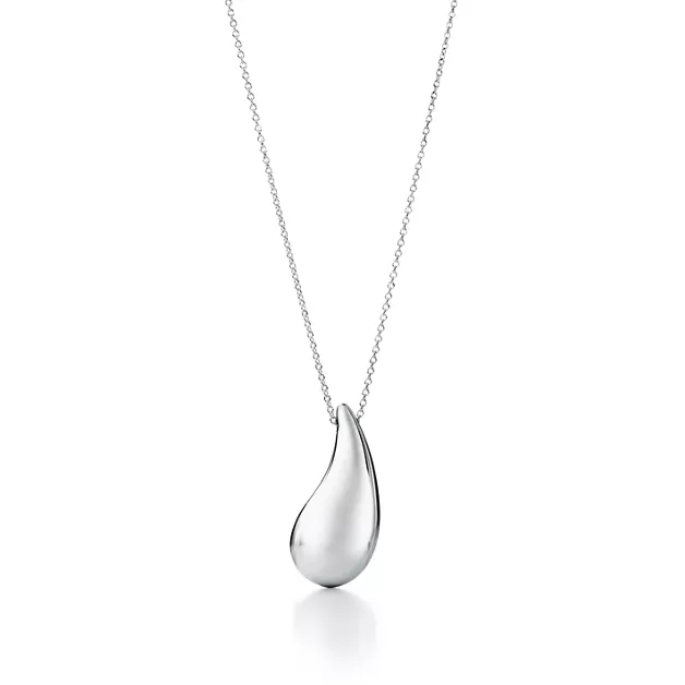 Le souvenir d'une goutte de pluie ou d'une scintillante perle de rosée au petit matin. Pendentif en argent massif. Sur une chaîne de 66 cm. Longueur de la larme : 29 mm. Créations originales, tous droits réservés à Elsa Peretti®.