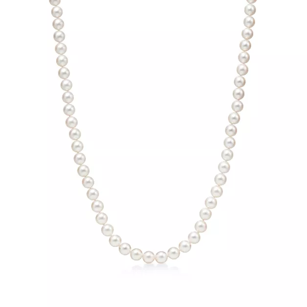 Collier de perles de culture d’Akoya avec fermoir en or blanc 18 carats. Longueur : 45,7 cm. Plaque décorative en or blanc 18 carats gravée de l’inscription « Tiffany & Co. » Perles, 6,5-7 mm.