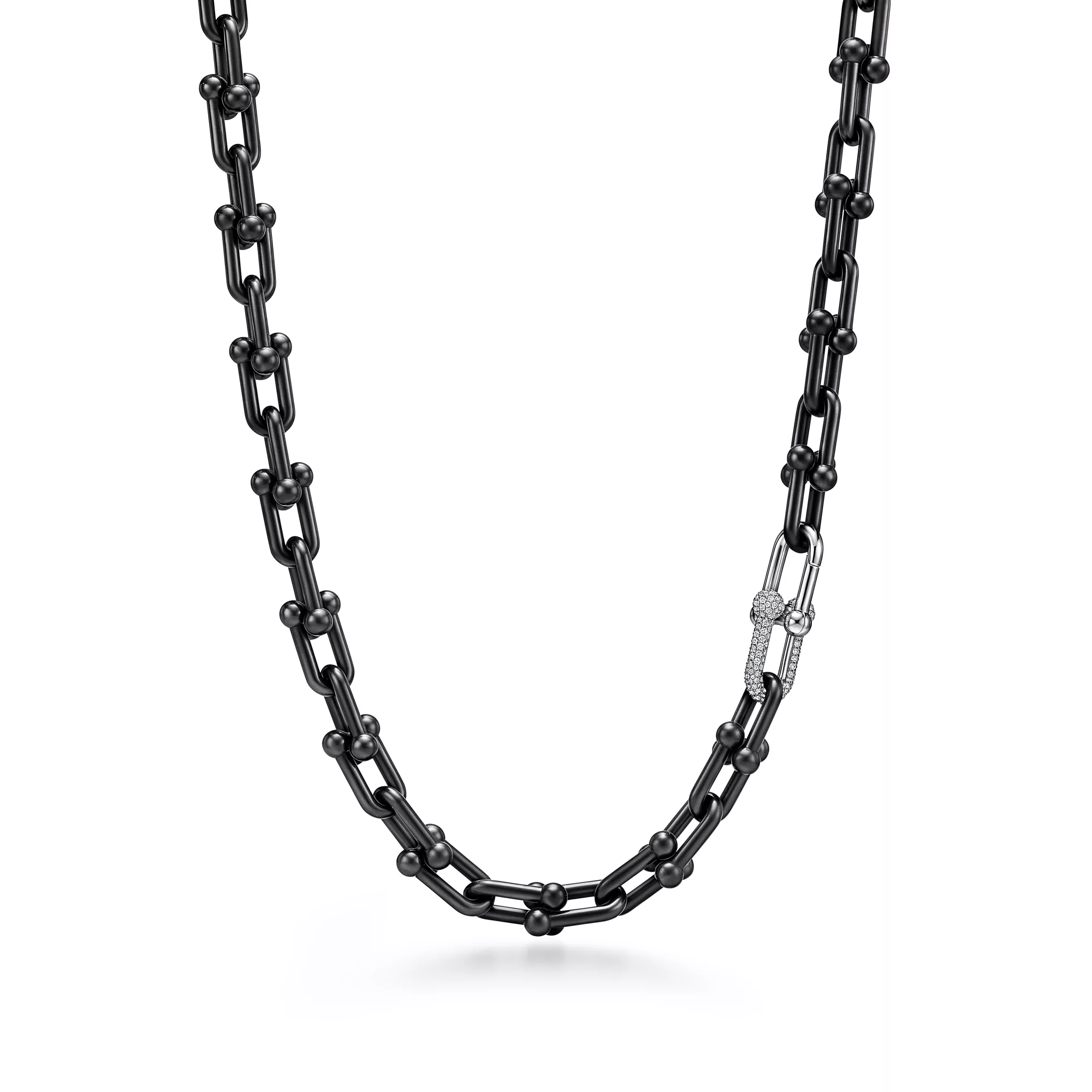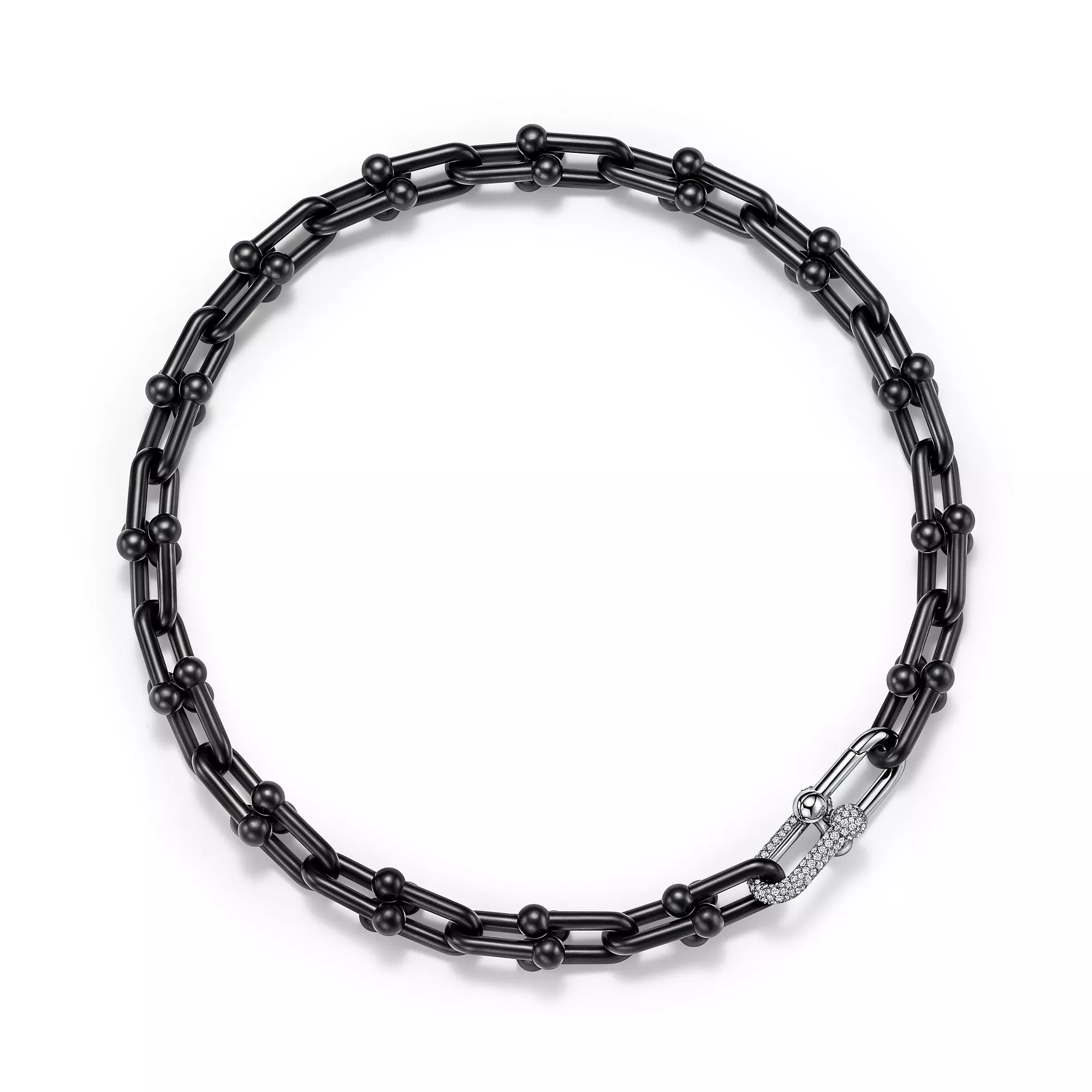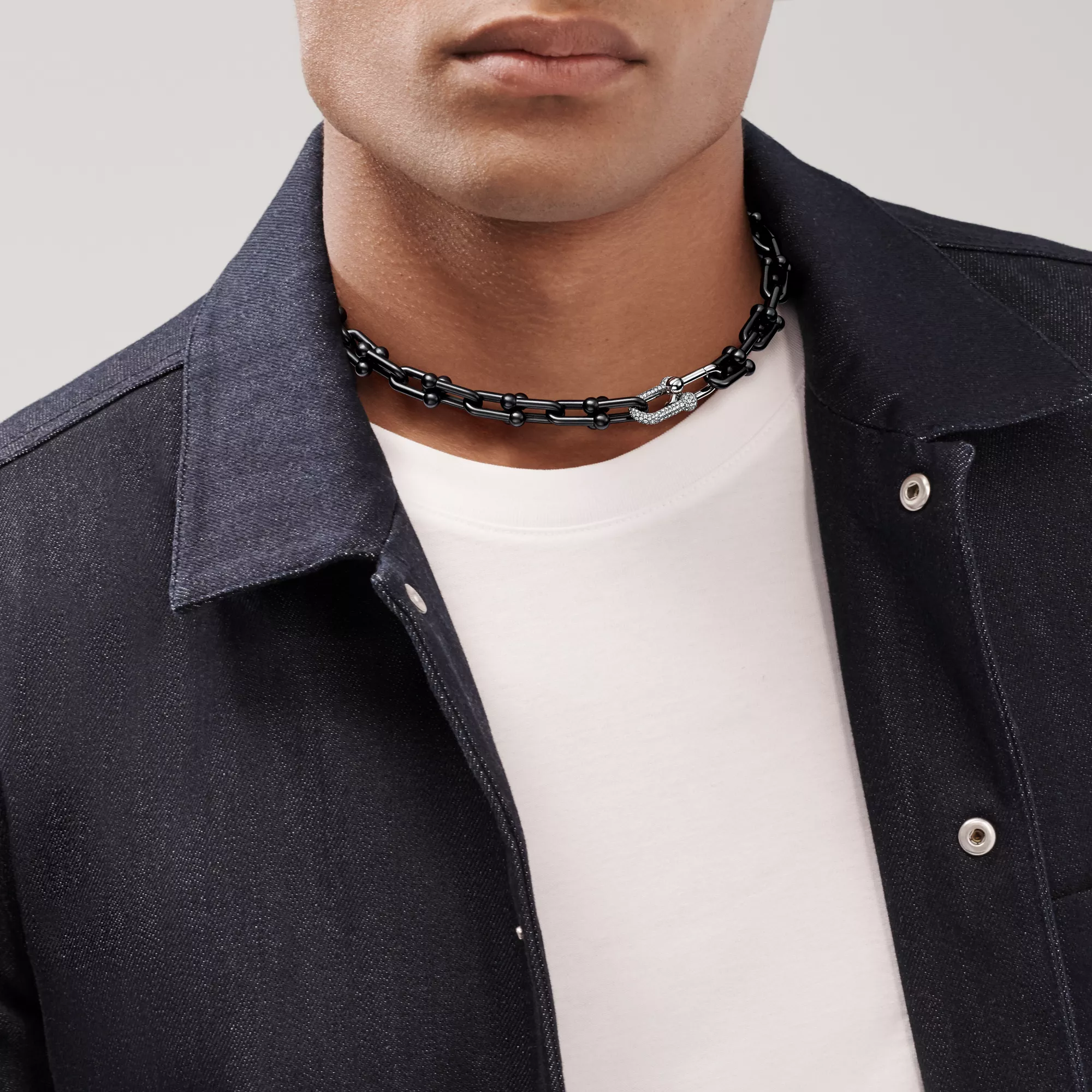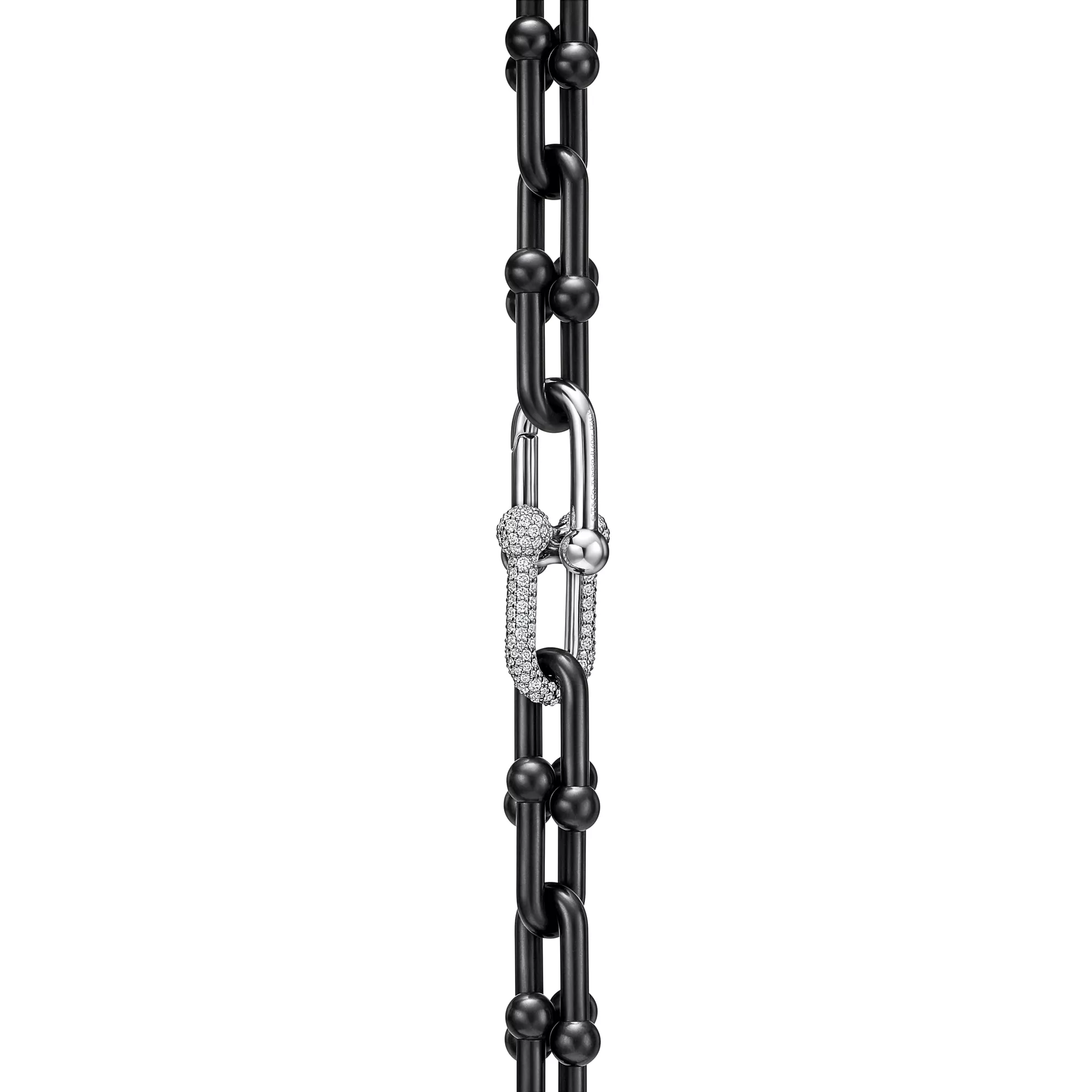 Tiffany HardWear est une ode au pouvoir transformateur de l’amour. Inspirée par un bracelet emblématique de 1962 tiré des archives de la Maison, la collection HardWear incarne une résilience à toute épreuve et un esprit désinhibé. Les maillons emblématiques de la collection associent le titane noir et le platine 950 millièmes dans un jeu de tension et de proportions. Des diamants soigneusement sertis en pavé apportent un éclat intense à ce bracelet. Portez-le seul ou conjugué avec d’autres métaux pour créer un effet contrasté.