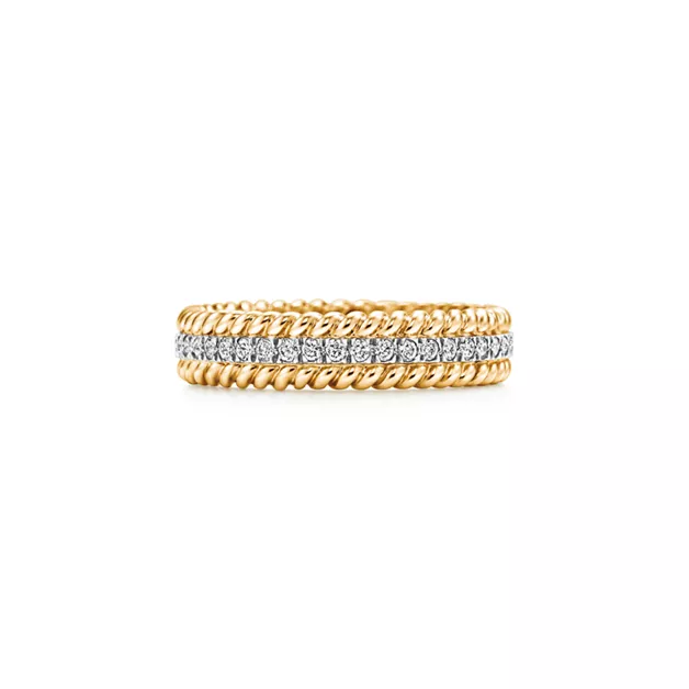Nous vous préviendrons lorsque cet article sera disponible : Tiffany Rope Bague X à deux rangs en or jaune, platine et diamants.