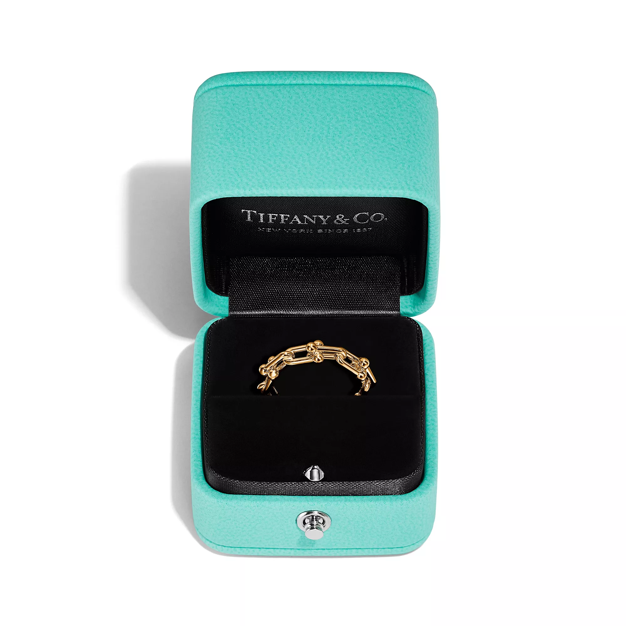 Tiffany HardWear est une ode au pouvoir transformateur de l’amour. Inspirée par un bracelet emblématique de 1962 tiré des archives de la Maison, la collection HardWear incarne une résilience à toute épreuve et un esprit désinhibé. Cette bague reprend le design à maillons emblématique de la collection en or jaune 18 carats. Éblouissante portée seule, elle s’associe parfaitement à d’autres bijoux en métaux variés.